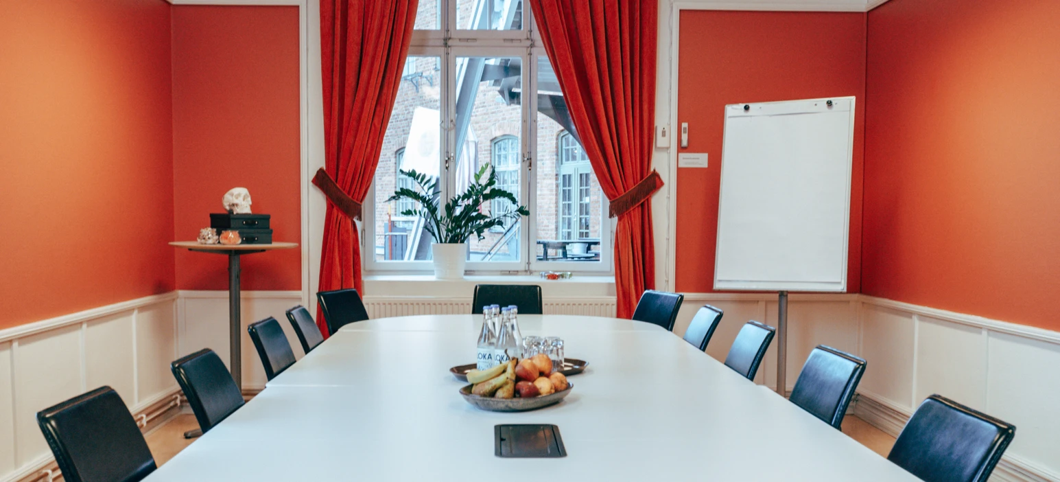 Projector and screen, as well as audio puck, camera and speakers for smooth hybrid meetings. Permanent furnishing.