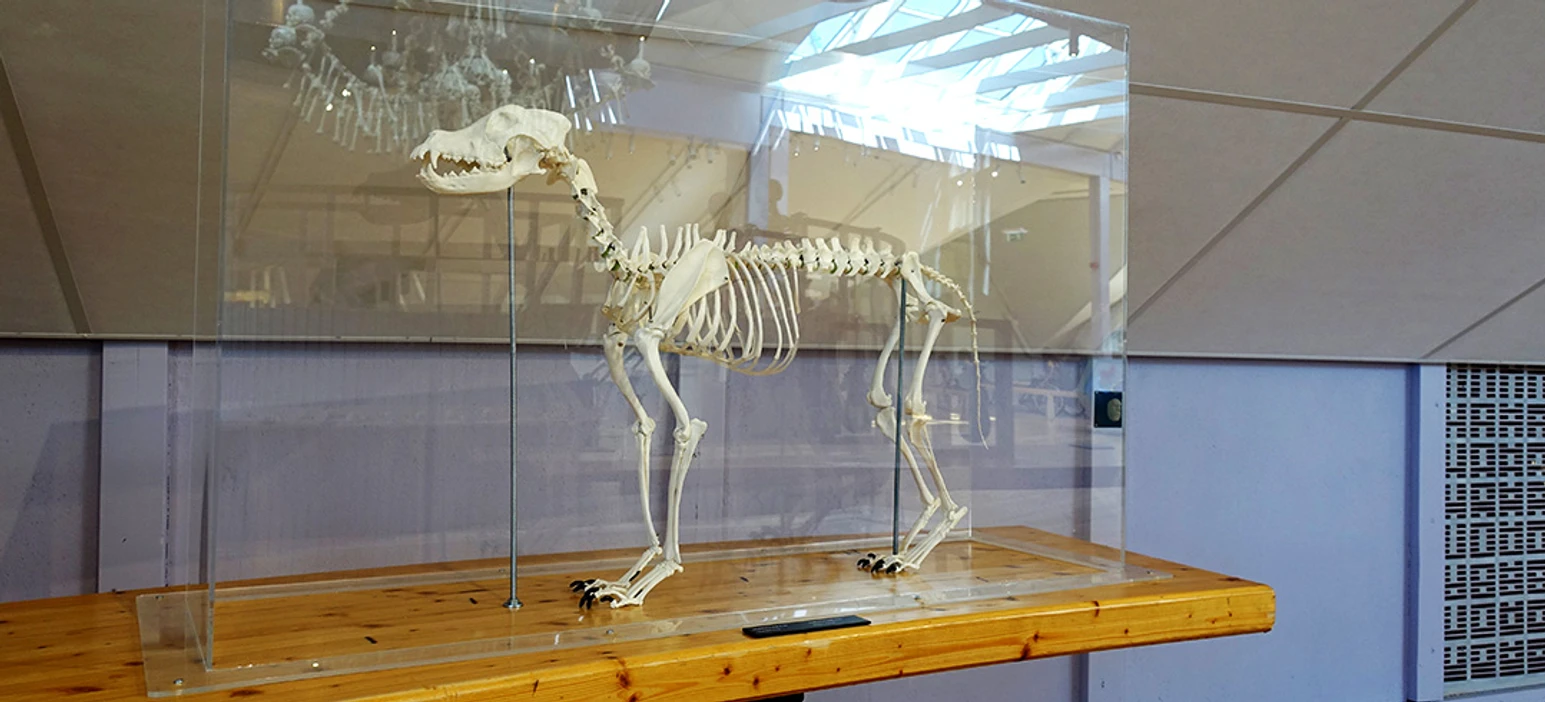 Känner du igen delar av skelettet hos Hunden Ra]e från människoskelettet? Du kan jämföra med något av skeletten som finns i utställningen.